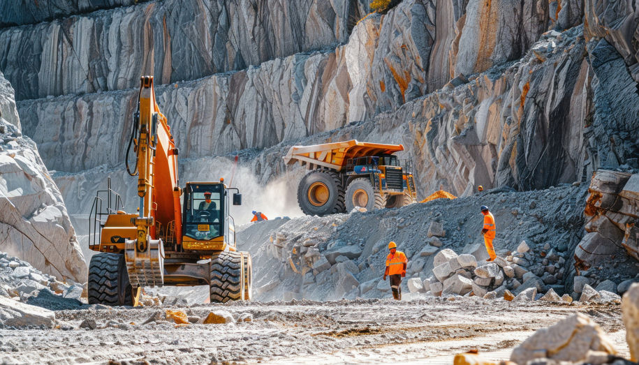A large excavator is operating next to a dump truck in a quarry, demonstrating the synergy of construction equipment